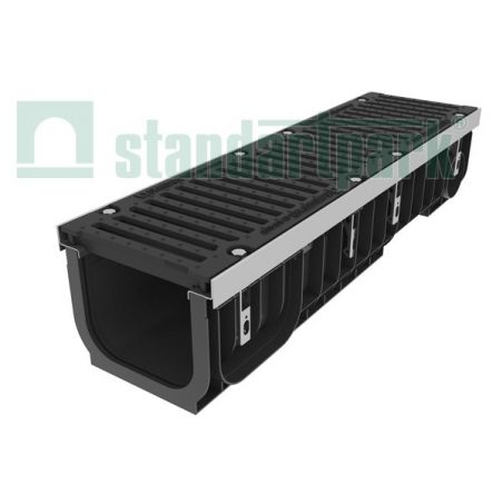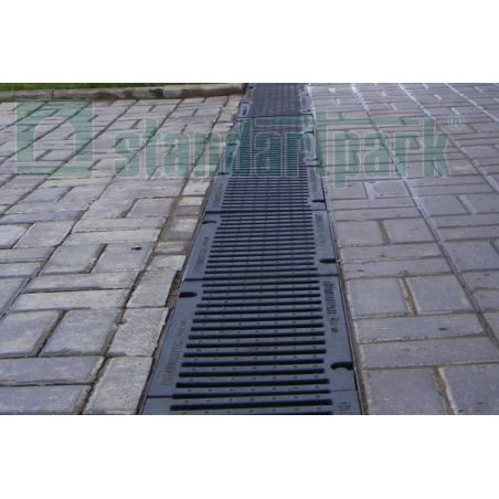 Trays of cold-resistant plastic, extra strong, impact-resistant Series MAX, resistant to aggressive environments with wide cross-section of 300 mm are used in areas with heavy traffic of passenger and freight transport and pedestrian areas, specifically designed for the removal of a large flow of rain water used in cottage construction, garages, car parks, multi-storey car parks, pedestrian walkways, sports facilities, industrial plants, chemical facilities. Trays linear drainage water is collected and withdrawn from the extended large surfaces. Simultaneously collected and conveyed to the relief surface runoff site. Currently, linear drainage systems are used in the system of stormwater. Each product is designed for a specific load class load classes will help to choose the right tray as required by your facility and to avoid problems during its further operation. Due to the increased usable channel width 300 mm, the tray 70 is able to skip l rainwater per second, a standard set supplied: a plastic tray with steel reinforcing nozzles, two lattice iron slot 500 mm long, fasteners (bolts and nuts). This tray has a load class D, - it allows to withstand 400kN = 40 m, the tray also has templates for lateral connection to the other chute, and vertical and horizontal connection to the sewer pipe of 110 mm diameter. To ensure reliable sealing compound between trays are used adhesives. All products Standartpark certified according to international quality control system.