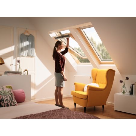 Мансардное окно Velux GZL 1051 с верхней ручкой открывания изготовлено в исполнении "стандарт". Открывается по центральной оси. Ручка открывания расположена сверху. Оснащено энергосберегающим однокамерным стеклопакетом. Окно изготавливается из клеянного соснового бруса, покрывается специальной пропиткой и лаком. Установка мансардных окон Velux GZL 1051 в Харькове выполняется нашими монтажниками, которые имеют сертификат установщика Велюкс.