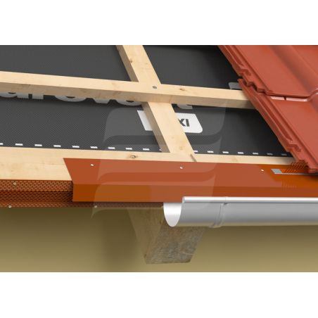 Карнизна планка алюмінієва використовувана для обробки і захисту покрівельного звису. Виготовлена з алюмінієвого листа покритого поліефірної фарбою і додатково захищена поліетиленовою плівкою знімною при монтажі. Має спеціальне профілювання, яке стабілізує і підвищує стійкість до розгинання. Випускається в декількох кольорах. Використовується для посилення і захисту схилу покрівлі в районі водостічної системи. Захищає від вологості і полегшує дренаж води надаючи одночасно естетичну обробку.