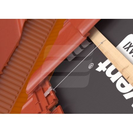 Скоба для обрізної черепиці складається з металевого затиску з нержавіючої сталі і сталевого дроту. Використовується для кріплення обрізний черепиці в районі ендови і в кутах покрівлі. Захищає черепицю від поддуванія вітром. Монтується затискачем до краю обрізний черепиці, а сталевим дротом за цвях в конструкції покрівлі - частіше в рейці. Використовується для монтажу бетонної та керамічної черепиці.