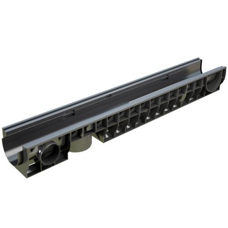 Лоток водовідвідний пластиковий глибиною 120 мм з можливістю бічного з'єднання з іншим лотком, а також вертикального підключення до каналізаційної труби діаметром 110мм.