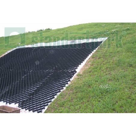 Георешетка-геокаркас h 50 висотою 5 см з осередком 30 см застосовується для армування грунтів в дорожньої, гідротехнічної і інших галузях сучасного будівництва. Завдяки великій несучій здатності і порівняно малій деформації георешітка може використовуватися в якості протиерозійного захисту укосів, при будівництві залізничних магістралей, автомобільних доріг, шляхопроводів, мостових переходів, тунелів, для зміцнення і озеленення прибережної зони водойм і каналів, укріплення русел малих водотоків. В результаті її використання значно знижується вартість будівництва і збільшується надійність конструкцій. Матеріал нейтральний до агресивного середовища, нетоксичний, стійкий до ультрафіолетовоіу випромінювання, масло-лугостійкі, стійкий до грунтового середовища, до прісної і солоної води, що зберігає його характеристики протягом багатьох років експлуатації. Виготовляється з пластикових матеріалів у вигляді модулів, транспортується в складеному стані і займає незначний обсяг і має малу вагу, проста в монтажі, кріплення георешіток на поверхнях виконують за допомогою Г-образних анкерів 12-16мм і довжиною від 0,6 до 1,2 м, виготовлених з високоміцних пластикових матеріалів або зі сталі. Між георешітками і поверхнею грунтового укосу вкладають розділовий і дренажний прошарок з нетканого геотекстилю щільністю 200-400 г / м, як заповнювач осередків георешіток застосовують грунт, щебінь, бетон. Завдяки пластичності і гнучкості можливе створення і зміцнення, що точно повторює конфігурацію русел або водовідвідних канав, георешітка перешкоджає вимиванню грунту і зберігає рослинність. При використанні георешітки збільшується термін служби об'єктів і що найголовніше - знижуються майбутні витрати на утримання і ремонт. Вся продукція.