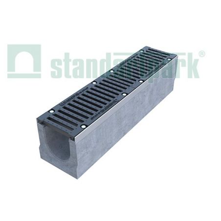Лотки фібробетони, особливо міцні, ударостійкі посиленою серії MAX - це серії лотків, посилених сталевими оцинкованими насадками і укомплектовані чавунними ґратами класом навантаження D400 = 40т, E600 = 60т, F900 = 90т. Комплекти високоміцних лотків знаходять широке застосування при будівництві та реконструкції вулиць, площ, парків культури і відпочинку, вокзалів, аеропортів, також водостоками посиленою серії комплектуються АЗС, станції технічного обслуговування вантажного транспорту, складські комплекси і термінали, виробничі площі та автостради, автобусні та вантажні парки , де високі механічні і динамічні навантаження, а також місця з інтенсивним рухом транспорту. Лотки посиленою серії MAX захищені насадками з оцинкованої сталі, які впресовані в бічні стінки лотка і пов'язані з заставними анкерами, армирующими лоток. У конструкції анкерів передбачена можливість заміни кріплення болта і гайки, що робить систему ремонтоспособность і довговічний, добре продумана система кріплення решітки до лотка дозволяє уникнути руйнування стінок каналу під дією великих поверхневих навантажень, виробляються лотки посиленою серії з фібробетону, полімербетону та пластику, а також з різними гідравлічними перетинами (DN 110, 160, 200, 300 і 500) і висотами (від h 130 до 600). Виникають ситуації, коли неможливо створити бажаний ухил за допомогою поверхні, але при цьому лінійний поверхневий водовідвід повинен бути і надійно функціонувати, для цього в посиленою серії MAX з фібробетону, передбачена серія літаків з різними висотами, що при установці дозволяє створювати так званий "каскад" , тобто перепад висот, за допомогою якого вода через пескоуловитель буде йти в зливову каналізацію. Даний лоток виготовлений з фібробетону, має клас навантаження Е600 = 60 т, поставляється стандартним комплектом: лоток з підсилюють насадками, дві решітки чавунні щілинні довгою 500 мм (марка чавуну ВЧ-50), кріплення (болти і гайки). Для забезпечення герметичного з'єднання лотків між собою використовують однокомпонентний герметик на основі MS-полімерів. Вся продукція Стандартпарк сертифікована відповідно до міжнародної системи управління якістю.
